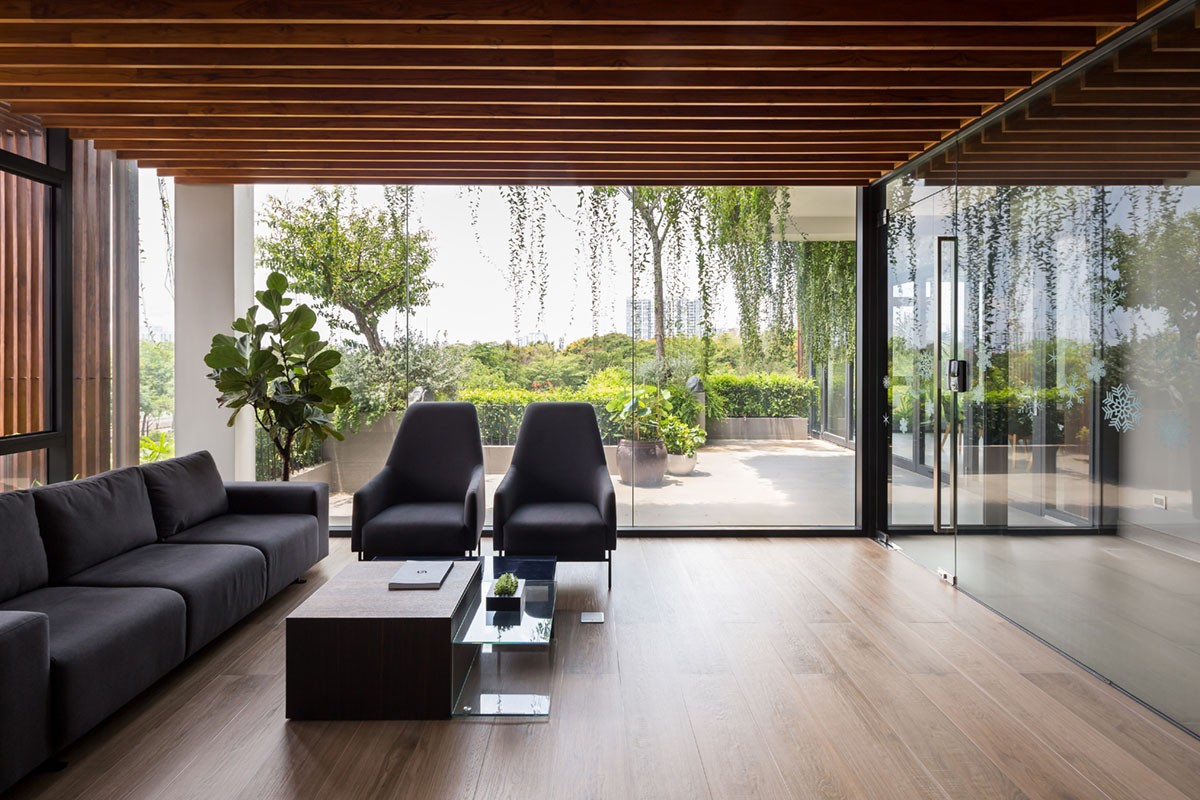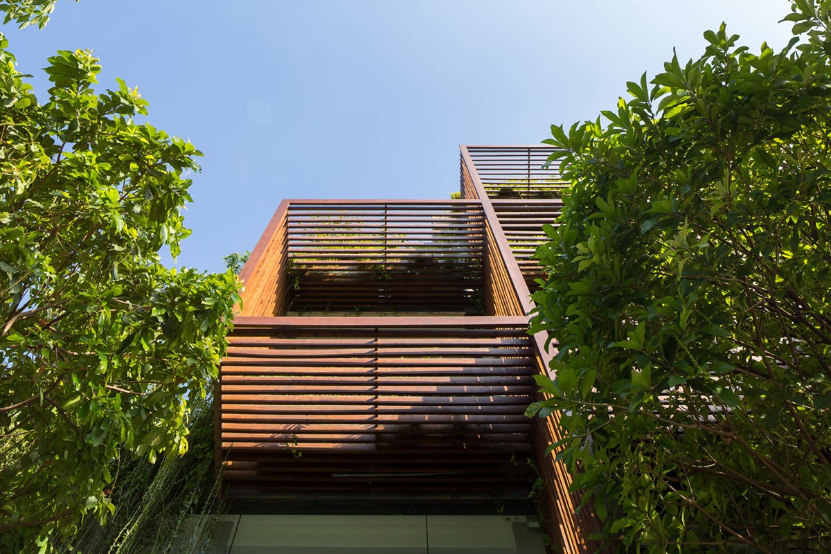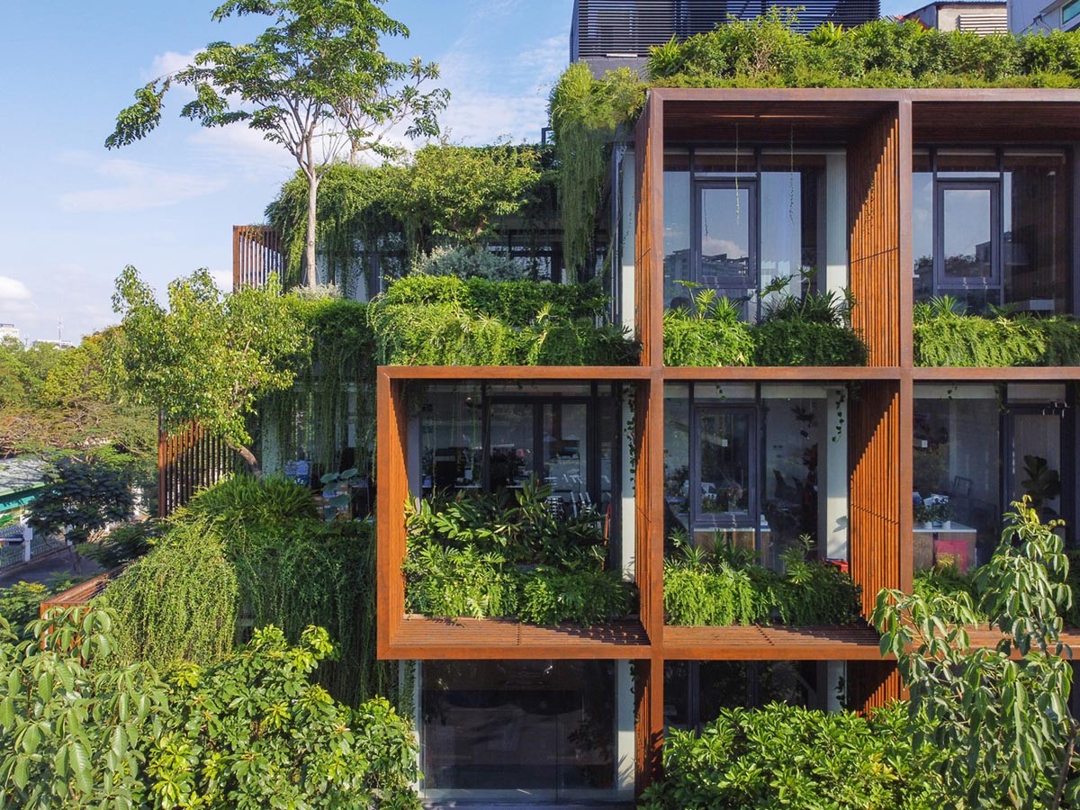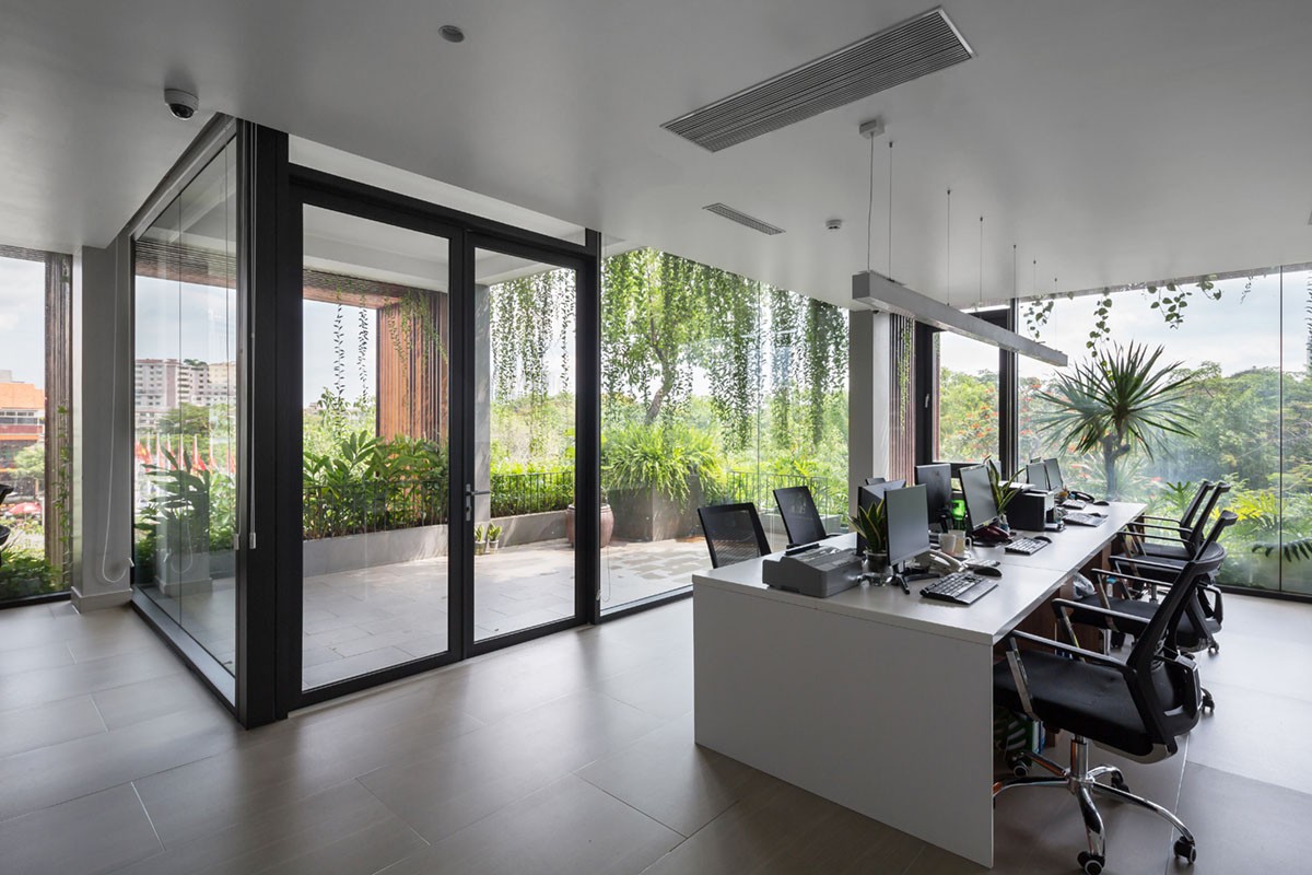 Với hệ cây xanh bao bọc công trình, mọi không gian trong văn phòng đều nhìn ra mảng xanh tươi mát, và mỗi tầng đều gắn kết với khoảng vườn ngoài trời, các khoảng vườn ở các tầng nhìn thấy nhau, giúp mọi người thưởng thức hơn. Hệ lam ô vuông che nắng hiệu quả cho góc nắng xéo vào công trình, đồng thời hệ kính lớn nhận ánh sáng tán xạ giúp công trình tiết kiệm được chi phí điện cho chiếu sáng và làm mát.
