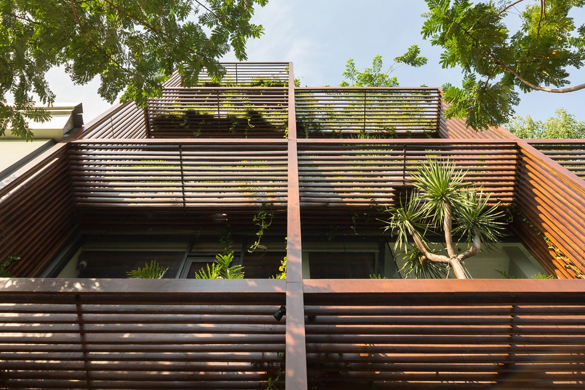 Với hệ cây xanh bao bọc công trình, mọi không gian trong văn phòng đều nhìn ra mảng xanh tươi mát, và mỗi tầng đều gắn kết với khoảng vườn ngoài trời, các khoảng vườn ở các tầng nhìn thấy nhau, giúp mọi người thưởng thức hơn. Hệ lam ô vuông che nắng hiệu quả cho góc nắng xéo vào công trình, đồng thời hệ kính lớn nhận ánh sáng tán xạ giúp công trình tiết kiệm được chi phí điện cho chiếu sáng và làm mát.